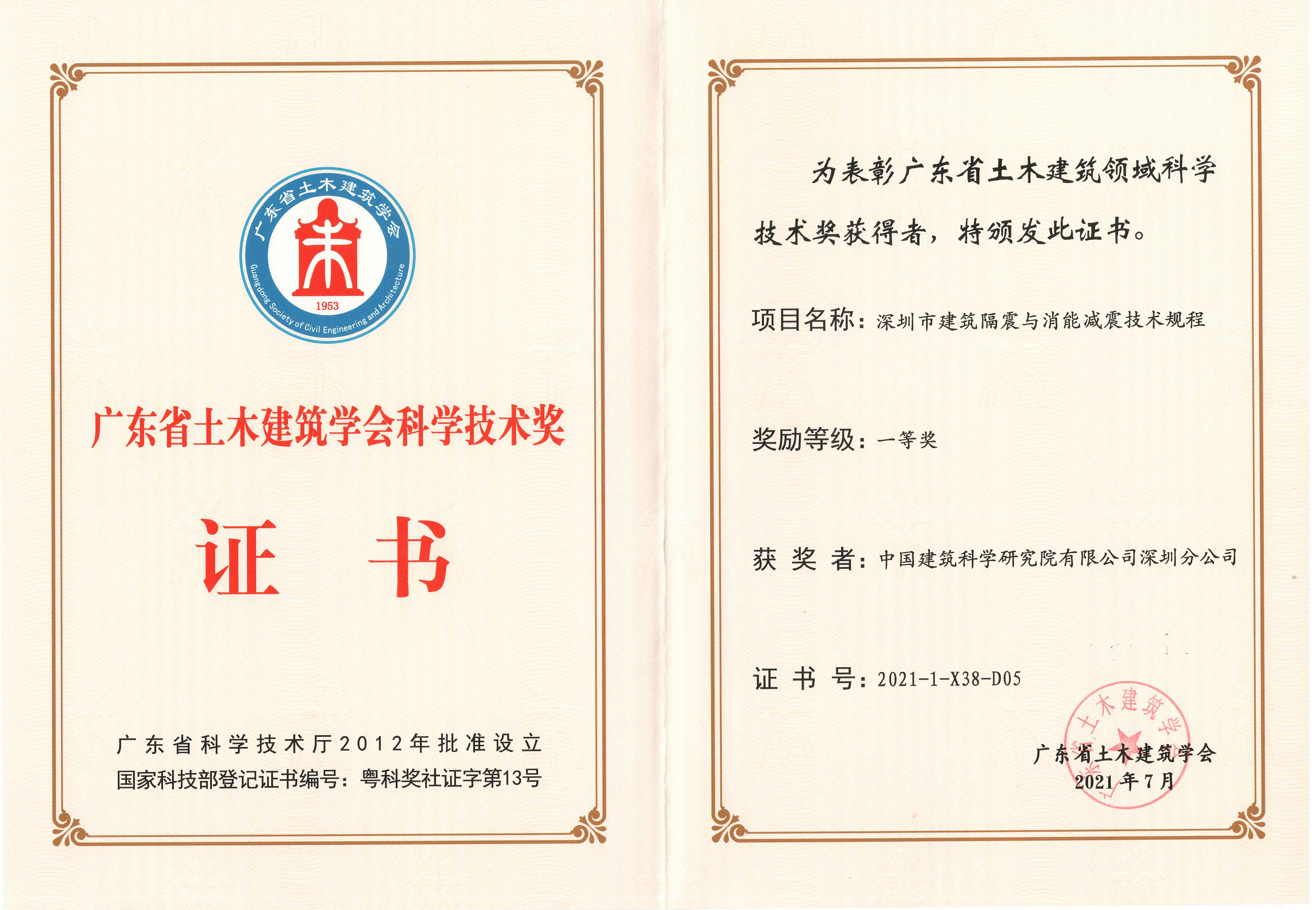 日前,廣東省土木建筑學會公布了2021年(第九屆)廣東省土木建筑學會科學技術獎獲獎”獲獎項目名單,經評審委員會評審及獎勵委員會審定,中國建研院深圳分公司參編的《深圳市建筑隔振與消能減震技術規程》項目榮獲廣東省土木建筑學會科學技術獎一等獎!總工程師劉健作為參編人員,全程參與了該技術規程的編制工作,對本規程的章節架構,編寫內容、技術指標的確定均有一定的貢獻。