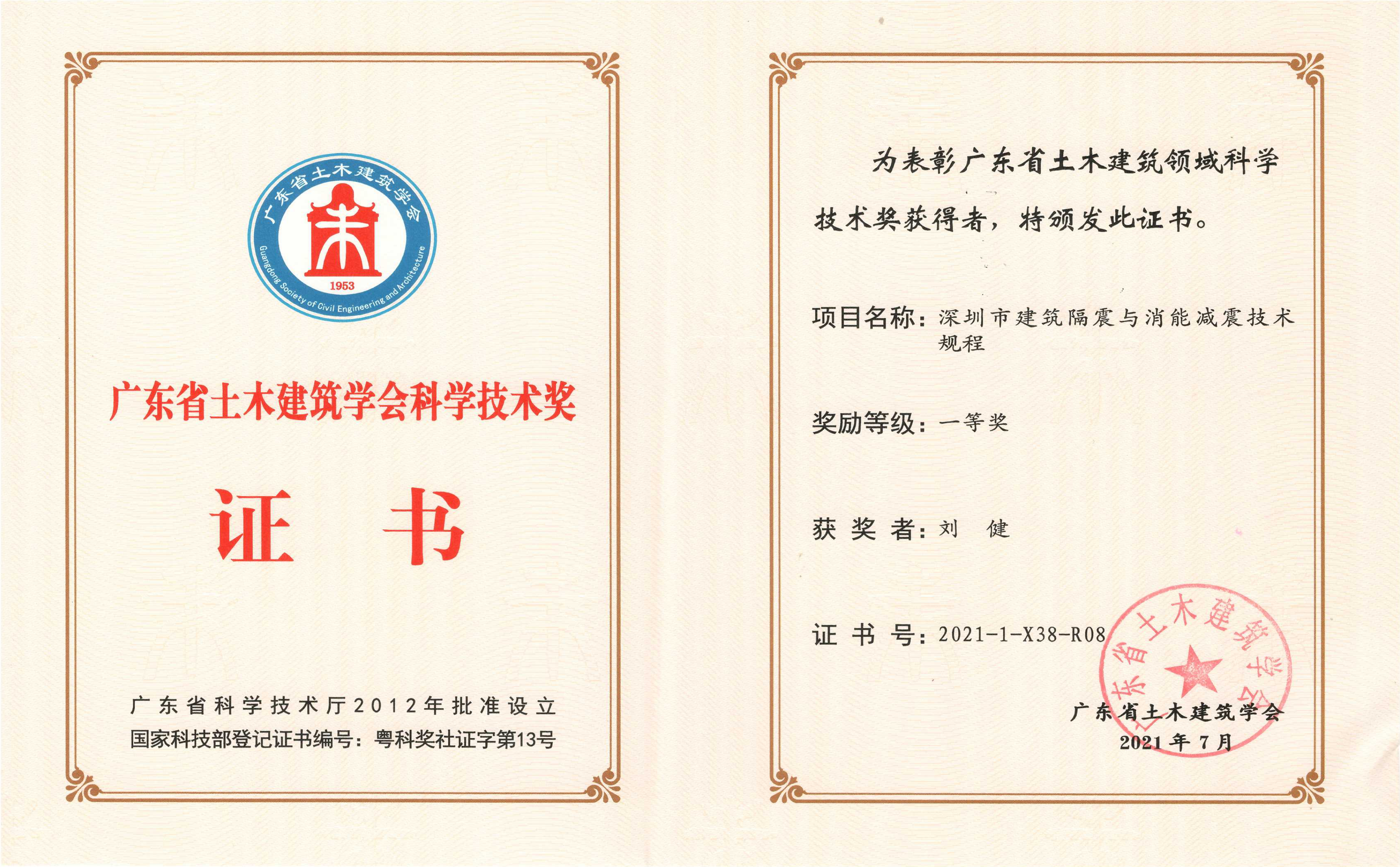中國建研院深圳分公司與總工程師劉健分別獲得廣東省土木建筑學會科學技術獎單位及個人一等獎